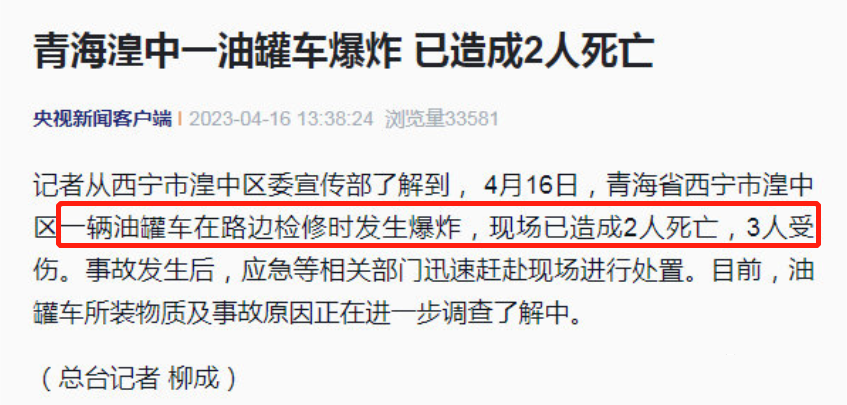 4月16日,青海省西寧市湟中區(qū)一輛油罐車在路邊檢修時發(fā)生爆炸,現(xiàn)場已造成2人死亡,3人受傷。